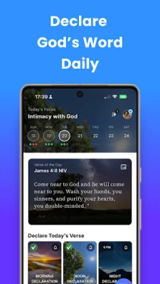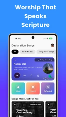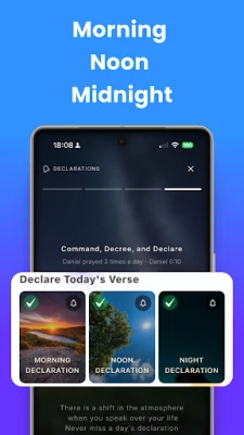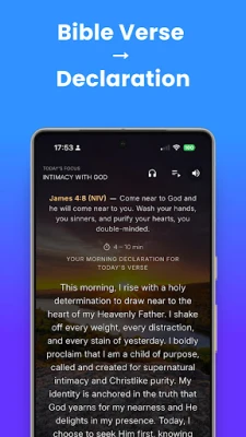 Išlaisvinkite Šventojo Rašto galią savo gyvenime. Su "Declare Bible" galite generuoti asmenines, tikėjimo kupinas deklaracijas iš bet kurios Biblijos eilutės, pritaikytas konkretiems jūsų poreikiams – finansiniams proveržiams, kūno gijimui, santuokos atstatymui ar pašaukimo aiškumui. Leiskite Dievo Žodžiui atgyti per garsą ir pranašiškas intonacijas, kurios pakylėja ir nukreipia jūsų širdį į Dangų. Kasdienybę praturtins unikali "Dienos patirtis", kurioje pasirinkta dienos eilutė susilieja su įkvepiančia muzika – nuo ramybės peizažų iki pergalingų tikėjimo himnų – traukiančia jus giliau į Viešpaties buvimą.