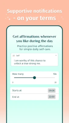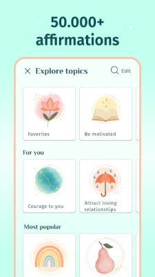 Kasdienis teigiamų afirmacijų praktikavimas yra galingas žingsnis link geresnio savęs. Įsivaizduokite, kad visą dieną jus lydėtų padrąsinantys pranešimai, kurie švelniai primintų apie jūsų stiprybę ir potencialą. Ši sistema siūlo galimybę nustatyti individualius priminimus ir pasirinkti iš plataus kasdienių intencijų spektro, suskirstyto į patogias „Kategorijas". Mėgstamiausias afirmacijas galite lengvai išsaugoti ar pasidalinti jomis su kitais, paversdami jas nuolatiniu įkvėpimo šaltiniu. Juk, kaip išmintingai sakoma, tampame tuo, kuo tikime. Leiskite sau pradėti tikėti savimi iš naujo ir atrasti savo vidinę galią.